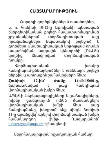 Հարգելի գործընկերներ և ուսանողներ, ս. թ. հունիսի 10-12-ը Աբովյանի պետականէներգետիկական քոլեջի հավատարմագրմանշրջանակներում փորձագիտական այցիրականացնելու նպատակով քոլեջում էգտնվելու Մասնագիտական կրթության որակիապահովման ազգային կենտրոնի (ՈԱԱԿ) կողմից ձևավորված փորձագիտականխումբը: